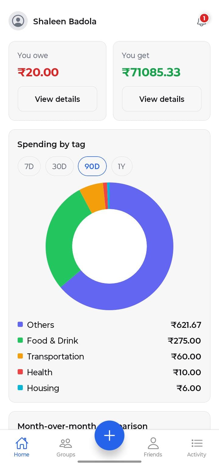 Create groups for trips or roommates, add friends for IOUs. All balances — who owes whom, who gets what — in a single app.
